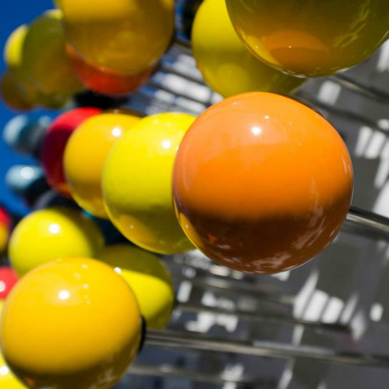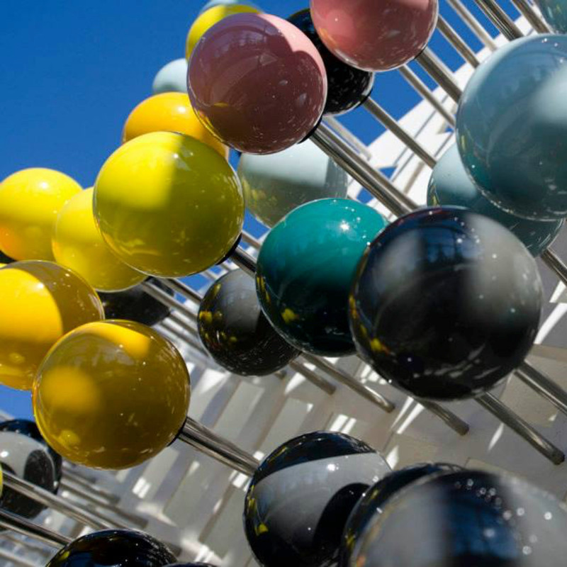 Pin Wall is a collaborative public artwork by Sara Hughes and Gregor Kregar, created from thousands of hand-glazed porcelain balls that project out from the museum building on stainless steel rods.