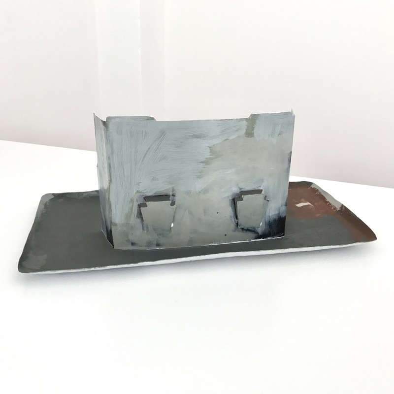 Object on tray. Copper, sterling silver, heat set paint, enamel paint